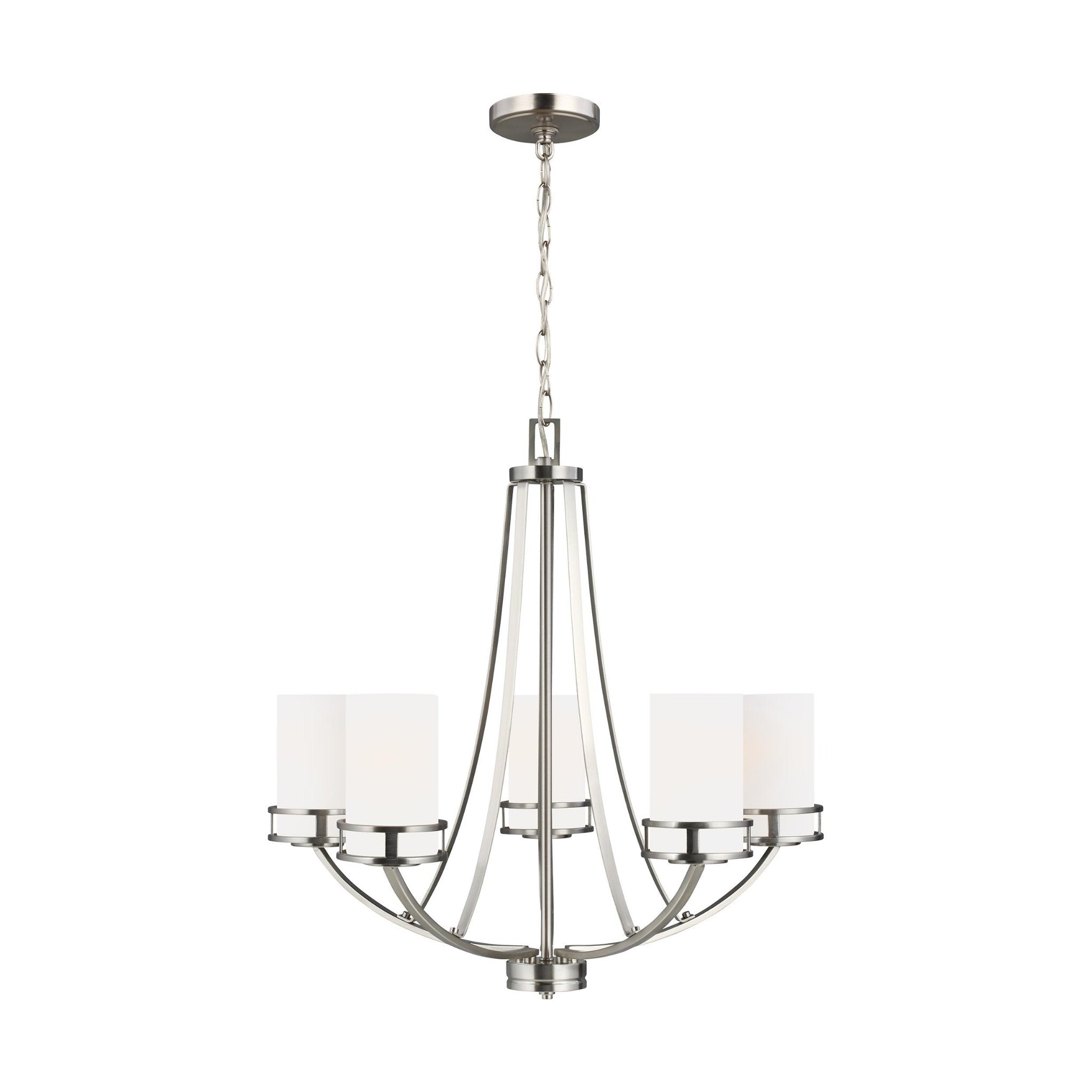 Robie Five Light Chandelier Transitional 23.375" Height Steel Round Etched / White Inside Shade in Brushed Nickel