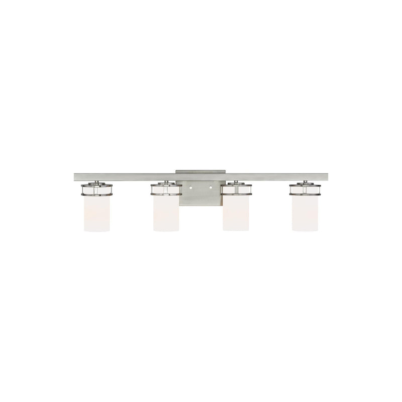 Robie Four Light Wall / Bath Transitional Fixture 34" Width 8.125" Height Steel Round Etched White Inside Shade in Brushed Nickel