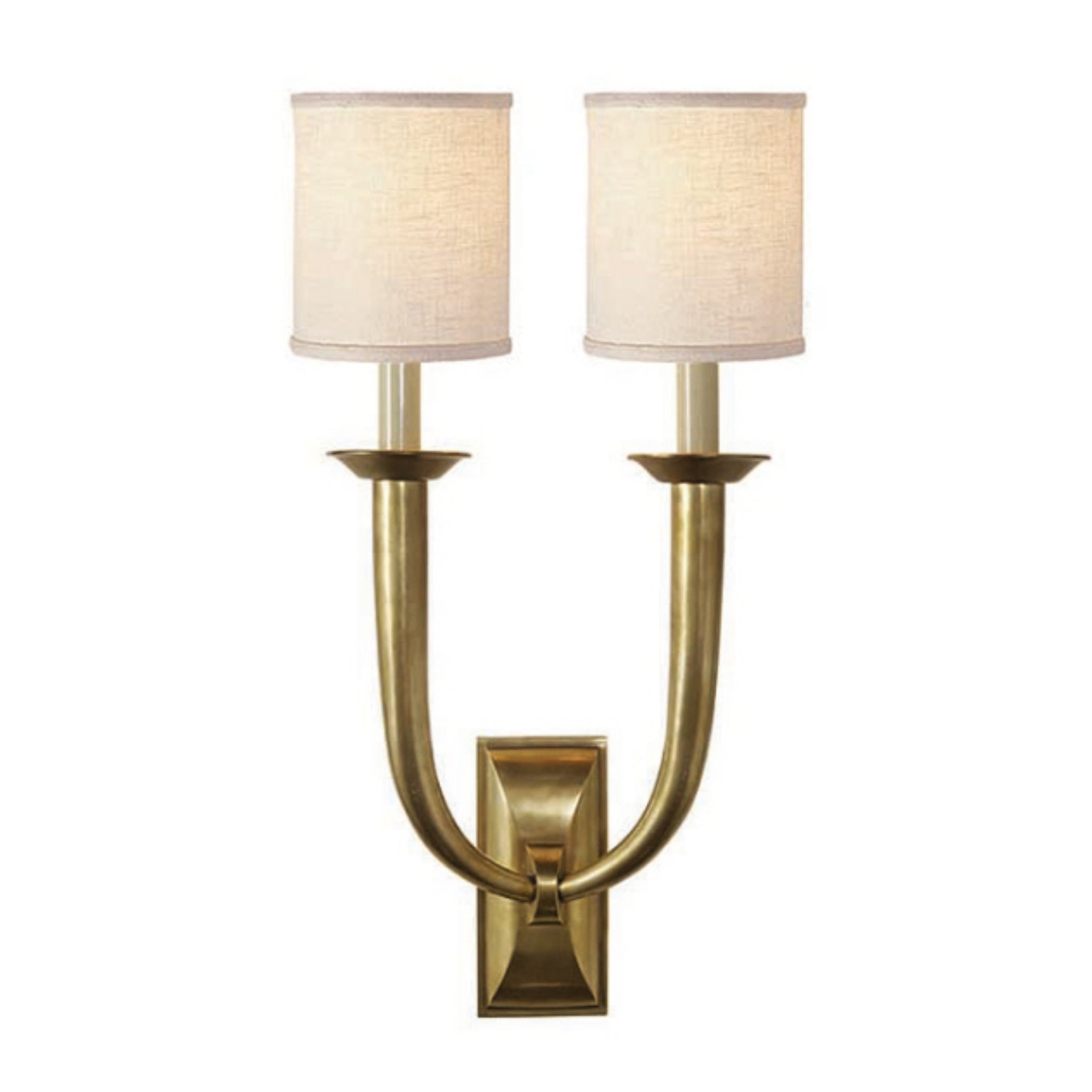 Visual Comfort French Deco Horn Double Sconce in Hand-Rubbed Antique Brass with Linen Shades Wall Light W12.25" x H22"