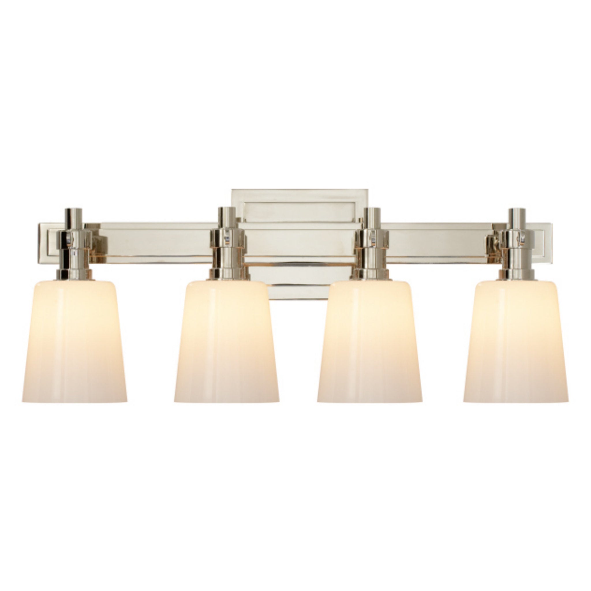 Thomas O'Brien Bryant Four-Light Bath Sconce in Polished Nickel with White Glass Wall Light W19.5" x H8"
